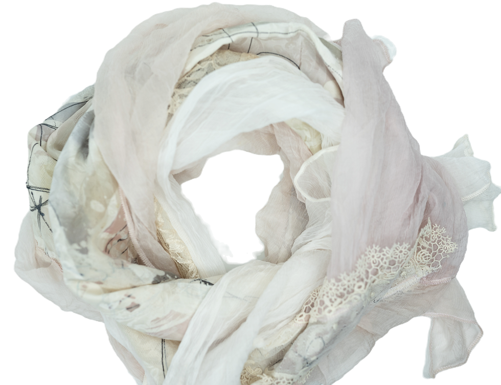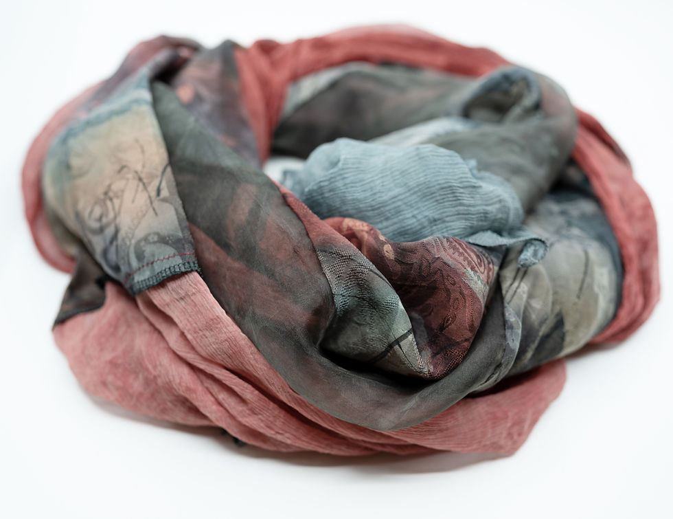 Die handbemalten Schals sind ergänzt mit farblich abgestimmter Mousselineseide und - bei einigen Modellen - mit Seidenstrick. Sie lassen sich als Cape oder als XL-Schal tragen. Grösse ca. 45x220cm; XL ca. 70x220cm